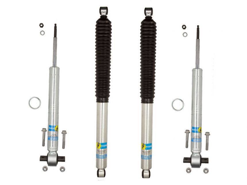 This is a great deal if you would like to change all of your suspension over to Bilsteins. Bilstein B8 5100 (Ride Height Adjustable) shock absorbers designed for the Ford F150 4wd feature multiple snap-ring grooves in the body allow for different spring seat positions, providing 0 inches to 2.5 inches of front lift with OE springs. These monotube shock absorbers have a 46mm digressive piston a with self-adjusting deflective disc valve setting. Bilstein 5100 shock absorbers provide increased wheel travel and improved handling. Utilizing a B8 5100 shock absorber is the easiest way to level out your vehicle.