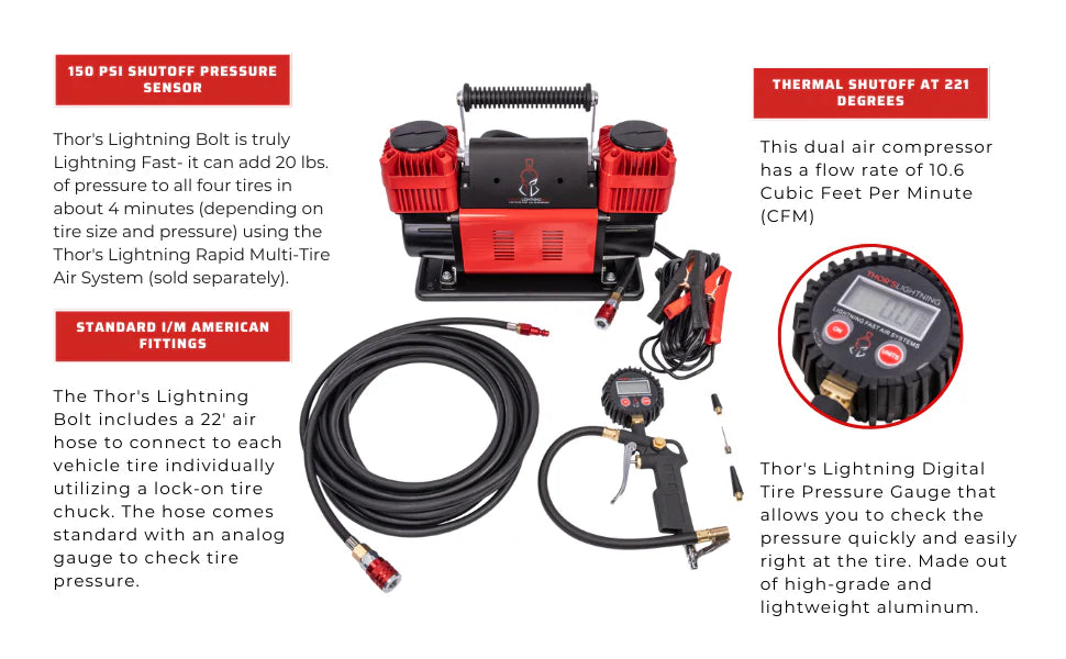 The Thor's Lightning Bolt True Dual 12v Portable Air Compressor Total Control will work out of the box with Thor's Lightning Rapid Multi-Tire Air Systems and is directly compatible with the Refuge MOLLE Air Compressor Mount. The Thor's Lightning Bolt True Dual Air Compressor Total Control is equipped standard with an 80-120 Pressure sensor and includes standard I/M fittings for maximum flexibility with tools- no adapters needed. The compressor also comes with attachments for inflatables, bicycle tires, and sports equipment.