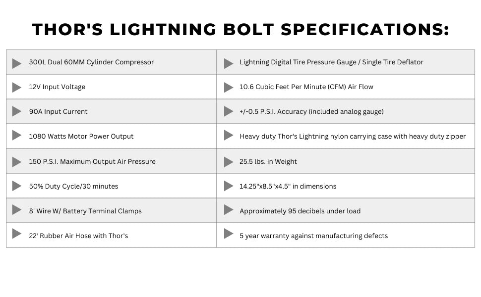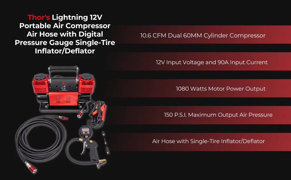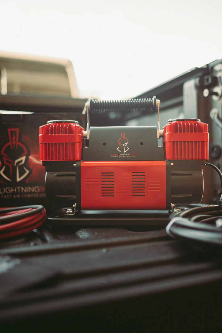 Thor's Lightning TotalControl 12v Dual Air Compressor – the epitome of portable air power. Set target pressure effortlessly, enjoy lightning-fast performance, and adapt to any tire count. With a robust 10.6 CFM flow rate, battery clamps for portability, and a 5-year warranty, it redefines on-the-go air solutions. Choose Thor's Lightning for innovation and flexibility on the road.
